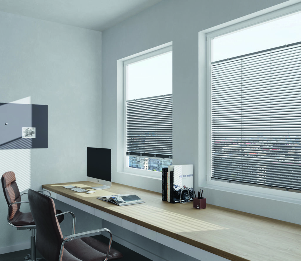 TwinLine: Diese Horizontal-Jalousie ist nach oben und unten frei verschiebbar. Der Behang lässt sich an jeder Position im Fenster positionieren. Mit dem einstellbaren Lamellen-Wendewinkel steuern Sie den Lichteinfall individuell. Die Montage erfolgt in die Glasleiste, wodurch die Funktion von Dreh- und Kippfenstern uneingeschränkt erhalten bleibt.